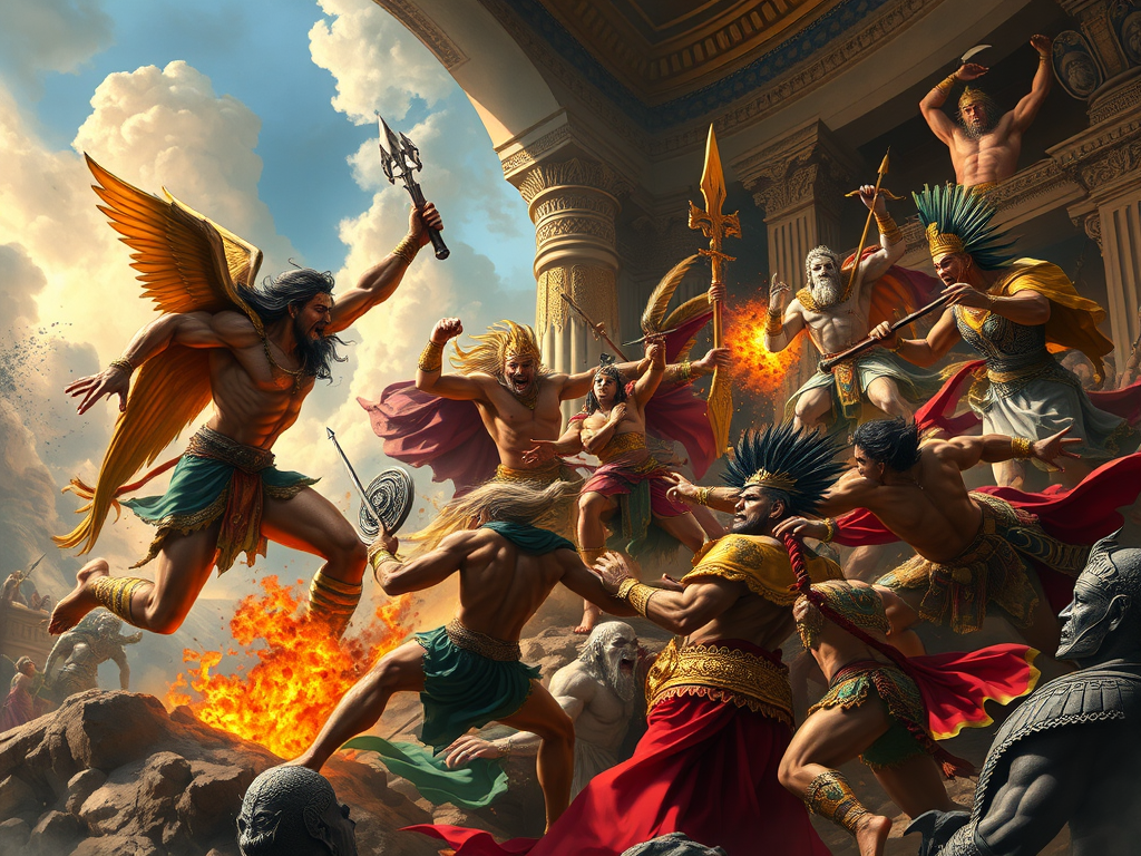 Mais un beau matin aux doigts de rose, il vit monter vers lui un char occupé par des divinités égyptiennes, Isis, Osiris, Amon, et toute une clique d’animaux divins, la vache, le chat, les crocodiles. Tous étaient là et tous demandaient à le voir. On ne saura jamais pourquoi parce qu’arrivèrent à ce moment-là les dieux indiens. On aurait dit qu’un barrage avait cédé parce que Zeus vit arriver en même temps les dieux romains, ses cousins, les Incas, les Mayas, les Inuits ainsi que d’autres délégations un peu plus réduites. Pour ne pas les fâcher, Zeus leur offrit l’hospitalité et leur proposa un grand repas de fête. Il y a de la place dans le domaine des dieux… Mais ils étaient quand même un peu serrés. Le singe Hanumant trouva le moyen de rompre le calme du palais divin. Par pure facétie, il tira la queue de la vache égyptienne Hathor. Celle-ci, humiliée, se retourna et de ses larges cornes l’envoya au-delà des lointains nuages. Toute la famille hindoue en fut courroucée. Bien qu’elle ait du respect pour la déesse vache, Indra fit retentir le plus violent des orages. Ce fut le déclic d’une bataille sauvage et générale. Dieux et déesses s’empoignèrent, se giflèrent et se frappèrent. Boxe, judo et karaté, tout y était. Les boucliers volaient comme des frisbees. Les dieux aztèques se distinguèrent par leur cruauté aussi inacceptable que l’Inquisition espagnole.