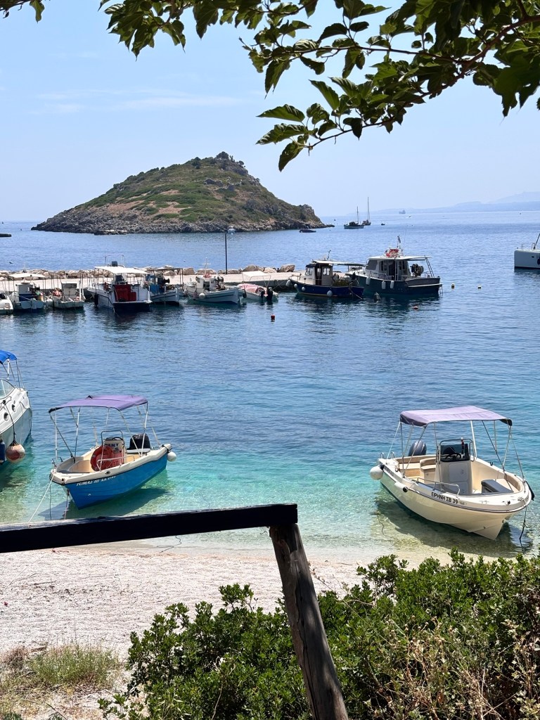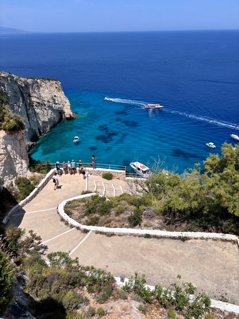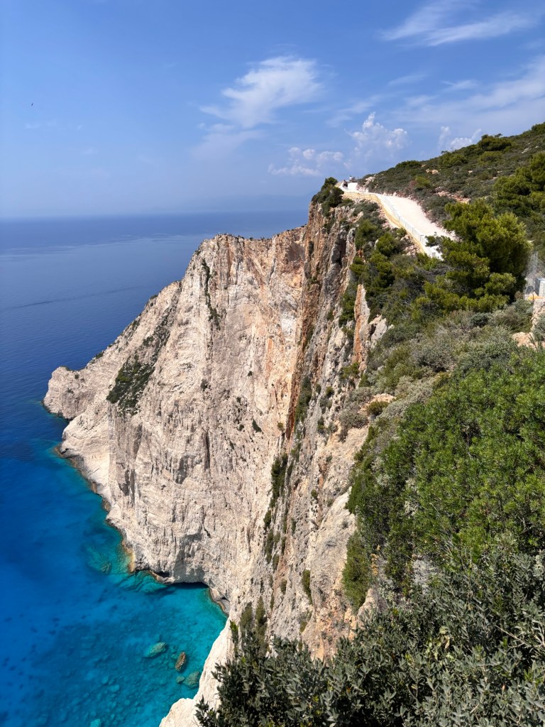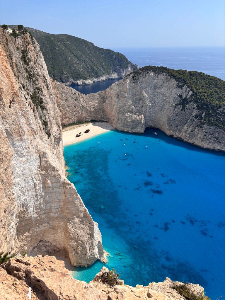 Des ports et des îlots un peu partout… La mer, les bateaux, la végétation, tout est couleurs vibrantes.C’est ici le coin pour aller voir les grottes bleues. On voit bien, en haut, la piste et plus loin la foule des photographes… … car ce site est l’un des plus connus de la Grèce : la plage interdite au public garde l’épave d’un vaisseau naufragé.