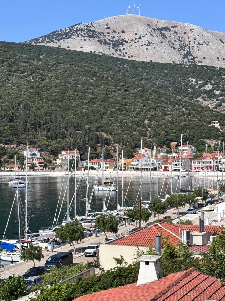 Ne ferme pas les yeux sur Agia Effimia. Continue longtemps à regarder ce joli port. En début de journée, le soleil en exacerbe chaque couleur. Regarde les événements les plus simples de la vie comme ce petit enfant qui pousse son minuscule vélo rouge sans pédales sur le môle, sous les regards admiratifs de ses parents. Ils empruntent le plateau du parking imposant bordé de gros rochers blancs d’un côté et d’orgueilleux voiliers de l’autre.
