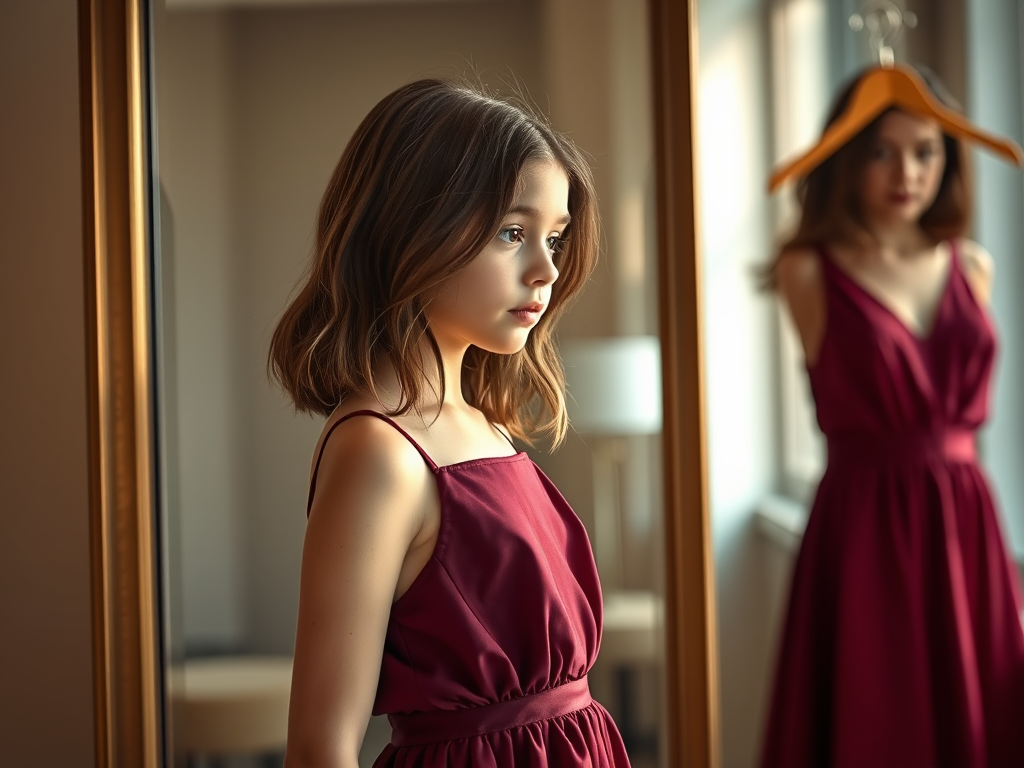 Ange ouvrit le premier carton et découvrit les superbes bottines dont elle rêvait depuis un moment. Dans la seconde boite, sous un délicat papier de soie, un soutien-gorge brillait de toutes ses paillettes et de ses reflets de moire. Elle fit une grimace mi amusée, mi surprise. Elle n’en avait jamais mis encore malgré les récentes plaisanteries de quelques garçons. Du troisième carton, elle déplia une magnifique robe trapèze. Elle se précipita pour l’essayer. Elle palpait sans cesse le tissu rouge profond comme pour s’assurer qu’il ne s’agissait pas d’un rêve. C’était une merveille ! Ange avait l’allure d’une femme mûre, équilibrée et radieuse. Sa maman précisa que, pour compléter cette magnifique tenue, il fallait un peu se maquiller… Ange, qui avait toujours refusé, accepta de compléter sa métamorphose. Maman sortit les crayons, les fards et tous ses produits de beauté. Il suffit de quelques minutes pour créer sans excès un visage lumineux.