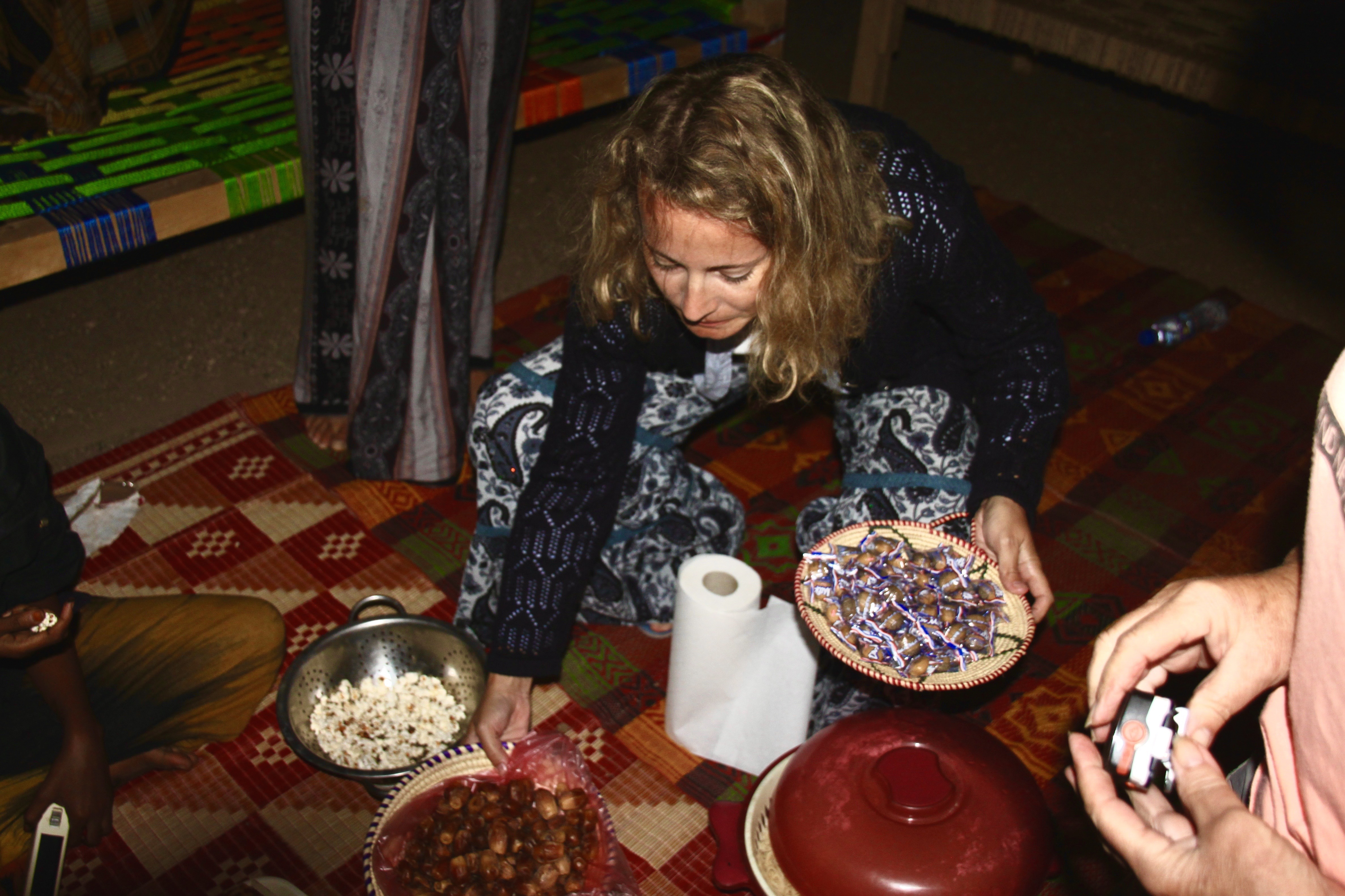 A chaque départ d’un membre de l’Association des Femmes-Abeilles à Dougoum, c’est devenu une tradition : nous organisons un goûter gourmand. Les principaux aliments sont les dattes, les biscuits et le pop-corn. La fête est organisée le soir pour permettre aux mamans et aux bergers d’être présents. C’est à cette occasion que les chansons traditionnelles peuvent rompre le silence de la nuit.