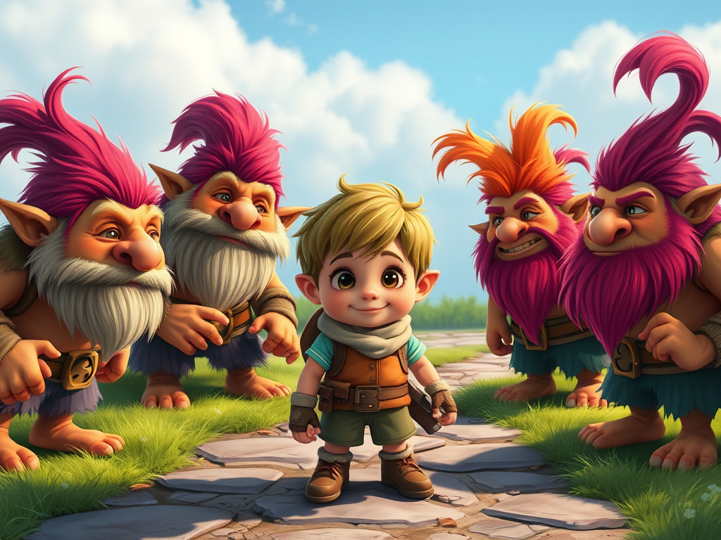 Vint soudain le moment où il se retrouva devant un carrefour de six chemins. Lequel prendre ? Il était plus de seize heures, il fallait rentrer. Il s’arrêta et réfléchit. Il n’était pas encore au bout de ses hypothèses, quand il vit arriver six trolls, chacun sur un sentier différent. Il salua les petits hommes et leur demanda quelle devrait être sa direction. Le premier troll lui répondit :